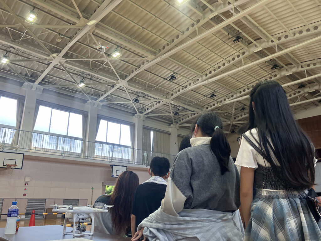 測量器械が自動で追尾しながら測定を行う様子に、子どもたちからは「すごい!」と驚きの声が上がりました。 - ドローンの飛行を実際に見てみよう