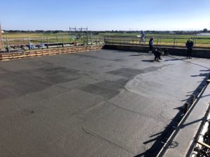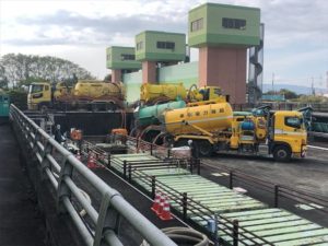 日中に最高気温が35度近くになる本日ですが、 弥富市の鎌島地区にある「弥富ポンプ場自家発棟」でコンクリート打設がありました。 前回のブログでコンクリート構造物の順序について話ました。 「足場を組む→型枠を組む→鉄筋を組む→型枠を組む→コンクリート」の順で 今回は一番最後の「コンクリートを流し込む作業」になります。 今回の自家発棟は流し込む生コンの量が多かった事もあり生コンを圧送するポンプ2台使用しての コンクリート打設とまりました。 コンクリートは簡単に分けて「水+セメント+・・・