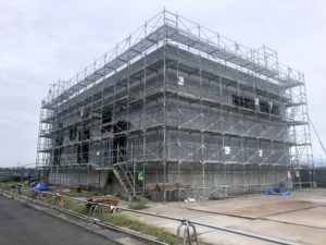 「弥富ポンプ場自家発棟」も外壁の検査が終わりました。仮設足場の解体工事が始まっています。 先に外部の仮設足場から解体です。シートをめくって現れた色は…「茶色」でした。 予想通りでした。まぁ隣のポンプ場と色を合わせるのが無難ですよね。 私的には白でも良かったのかなぁ…と思ったんですが。 外部足場解体に3日、内部足場解体はもっと時間かかりそうです。(すべて人力で搬出する為)