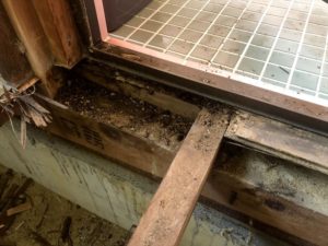 先回、キッチンの床がフワフワする話はお話しましたが、お客様から「脱衣室の床もフワフワするので…」と伺っていました。 状況は全く同じですが、風呂場がタイル張りのお風呂だったので少し心配でした。 最近は殆どのお宅で「ユニットバス」を採用していますが、タイル張りの昔ながらの風呂だと「風呂場の水気」で下地が腐ったり、湿気のせいで「シロアリの繁殖」が進む事も考えられます。 そして床をめくってみた所… ↓( ゚Д゚)↓ やはりタイルの目地とアルミドアの隙間から水が入り込み、下地の木材が腐・・・